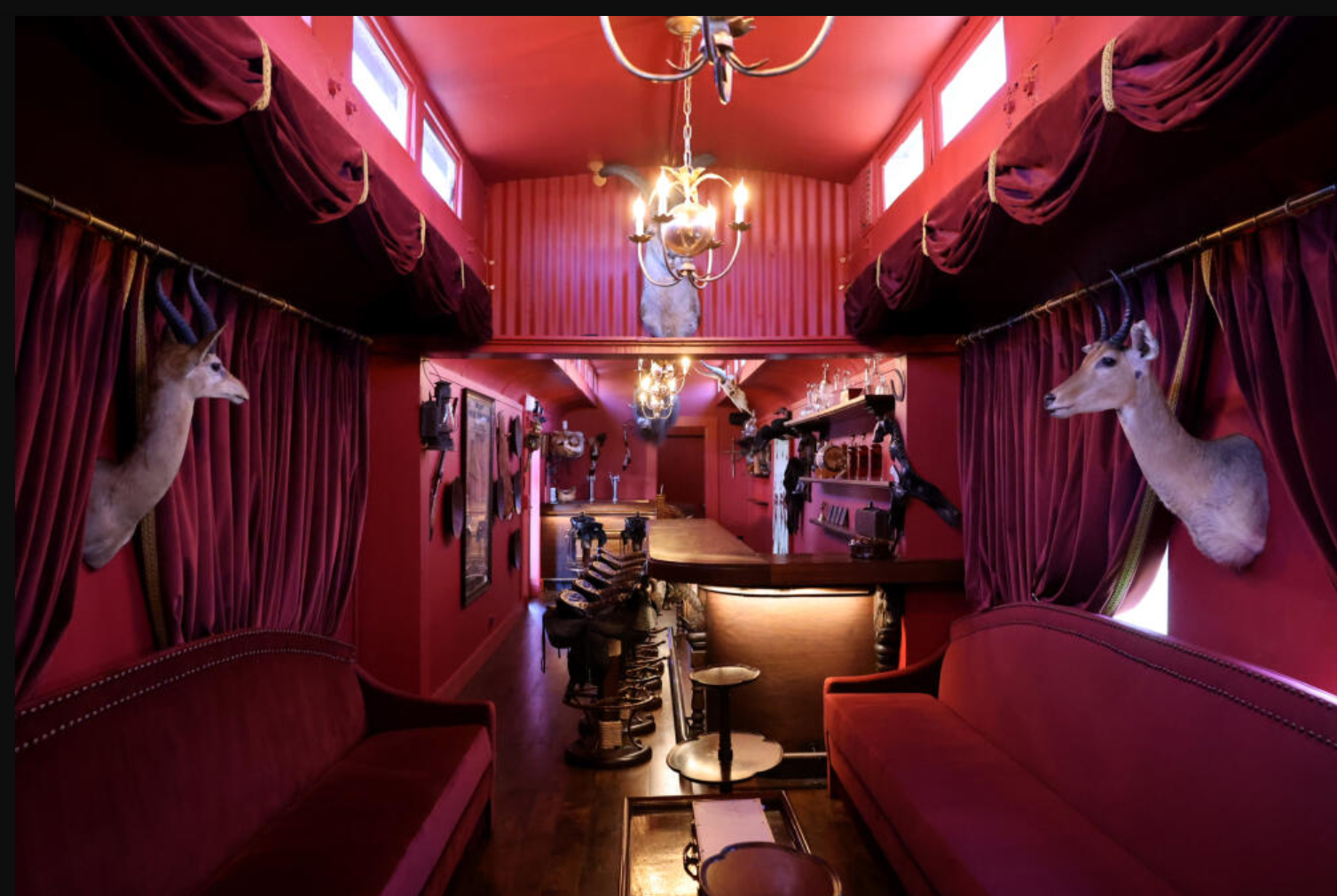 1. The Parlor Car: Elegant and refined, this Orient Express inspired car is perfect for savoring fine oysters and champagne. I created the grotto style chandeliers in my studio. Real mother or pearl wall panels run the length of the car